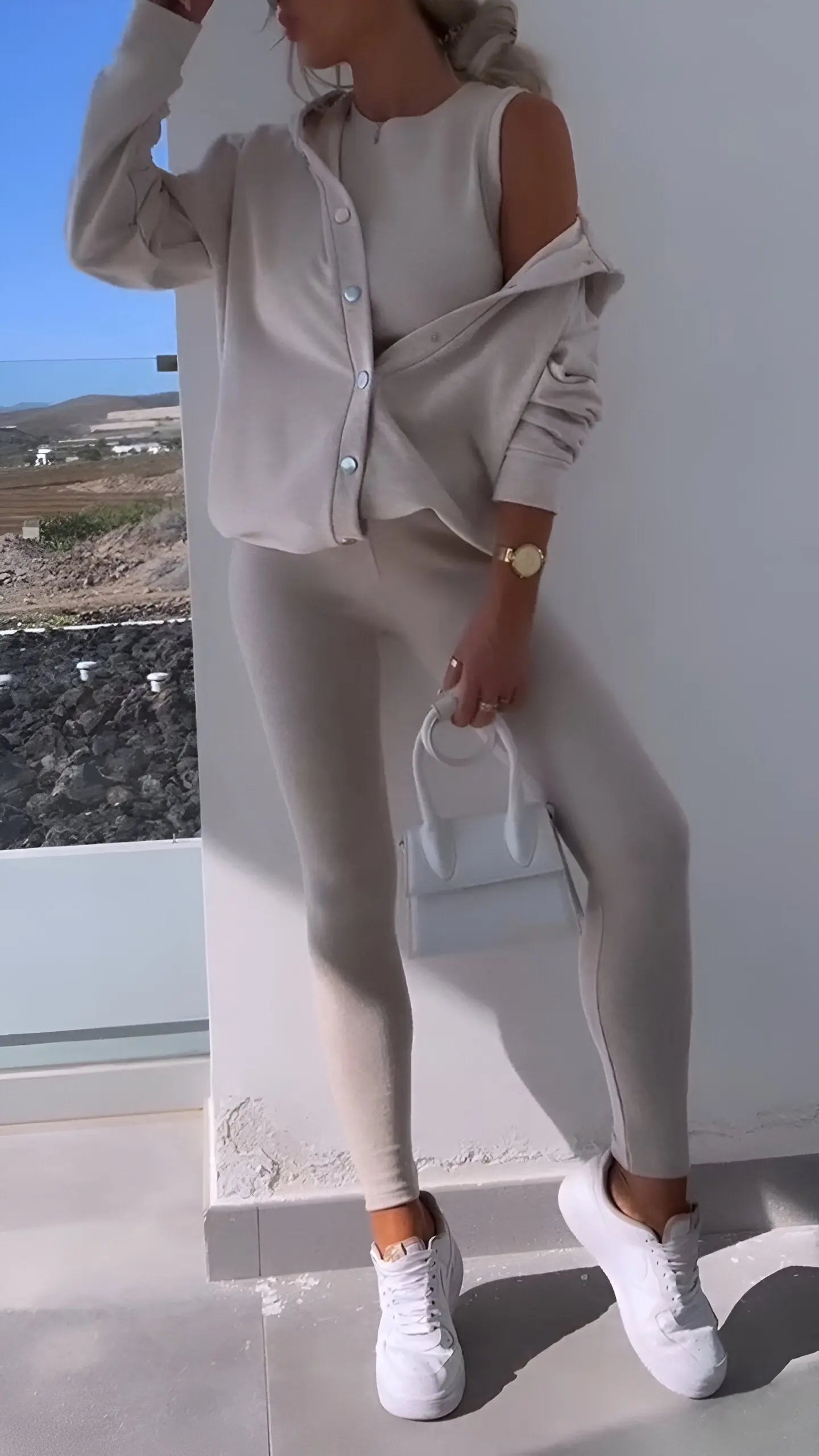 Confortable et tendance, Iris associe une veste ajustée et un pantalon assorti pour un look sportif et élégant. Idéal pour une tenue décontractée ou active, cet ensemble en coton assure une liberté de mouvement optimale.