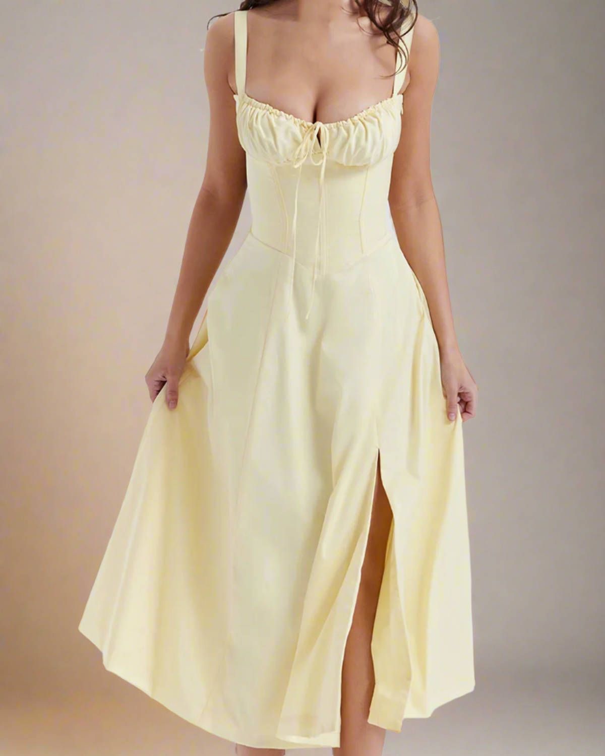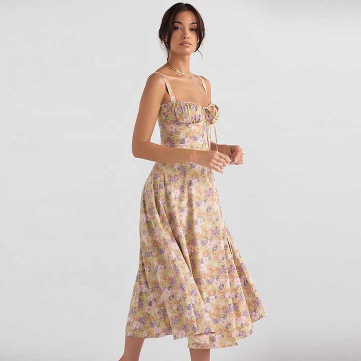 Détails : longueur midi avec un haut corseté et un imprimé floral romantique