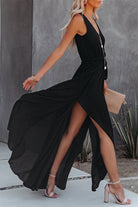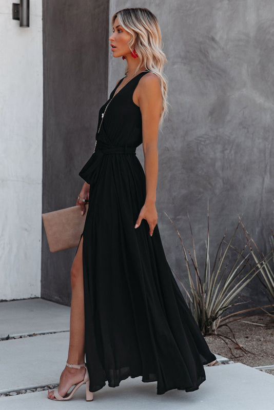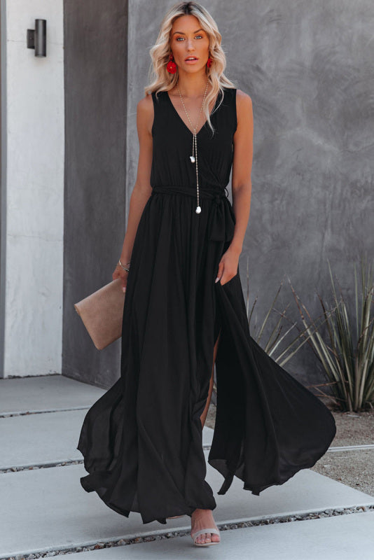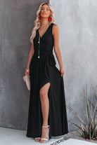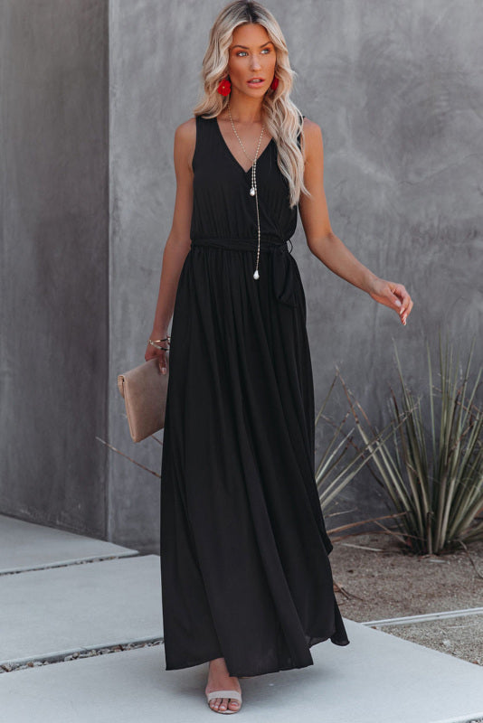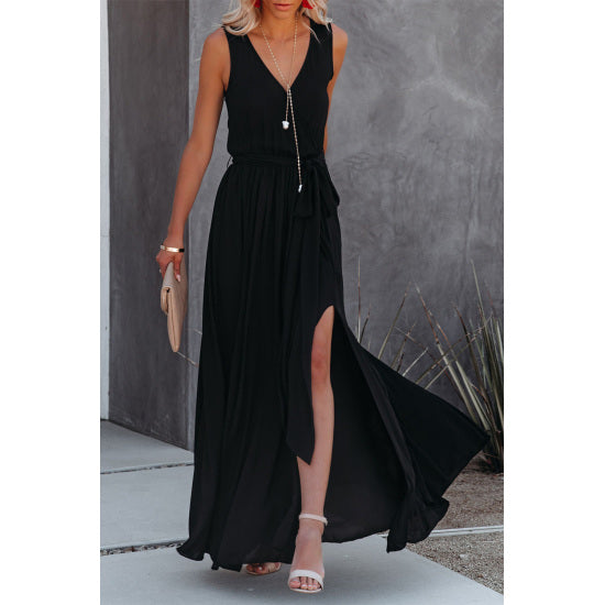 Affirmez votre style avec la robe longue noire Kelly à col en V, dotée d’une ceinture à la taille et d’une fente audacieuse sur le côté. Parfaite pour passer avec élégance du jour à la nuit, sans effort.