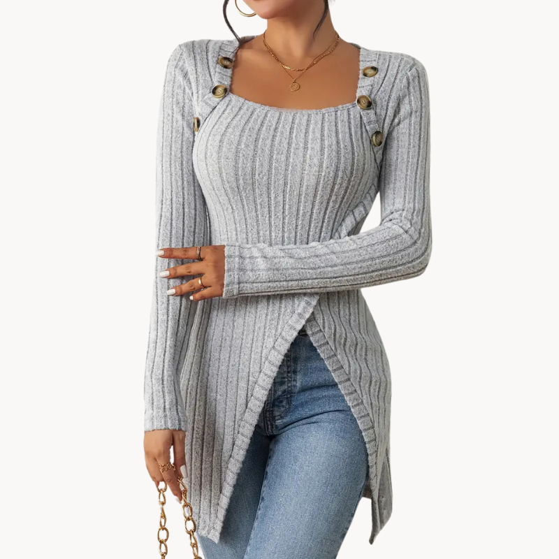 Lorena – Haut asymétrique côtelé avec boutons décoratifs et coupe élégante