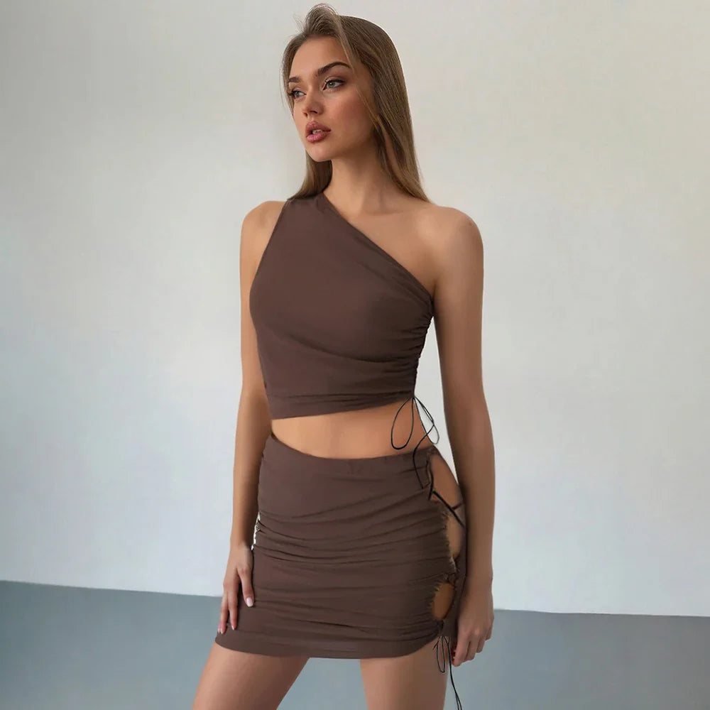 Composé d’un crop top asymétrique à une épaule et d’une jupe mini assortie, cet ensemble met en valeur la silhouette avec ses fronces flatteuses. Les détails ajustables à cordon permettent d’adapter la coupe selon vos envies. Idéal pour une soirée ou un look tendance au quotidien !